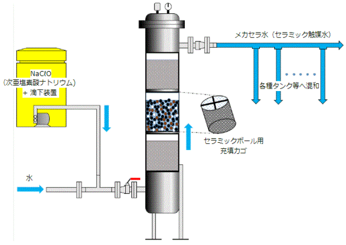 メカセラ・システムは水の中でも活性酸素(ヒドロキシラジカル)が発生する特殊なセラミックス(触媒)に微量の塩素(次亜塩素酸ナトリウム)を添加する事で、塩素の持つエ ネルギーがセラミックスに作用し、丁度、酸化チタンに紫外線が当たった時のように、水の中や、光の届かない所でも活性酸素(ヒドロキシラジカル)を発生させます。この反応を活用したテクノロジーなのです